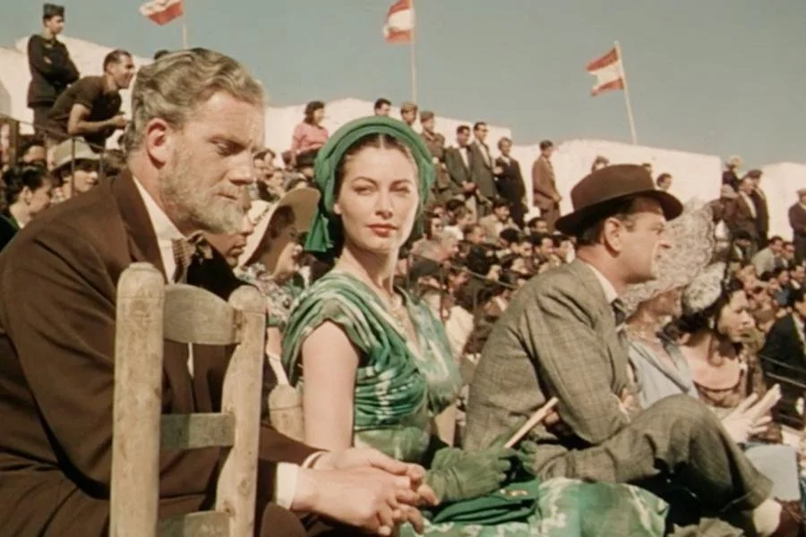 While watching a bull-fight, Ava Gardner’s character Pandora wears a green dress with a matching green headscarf.